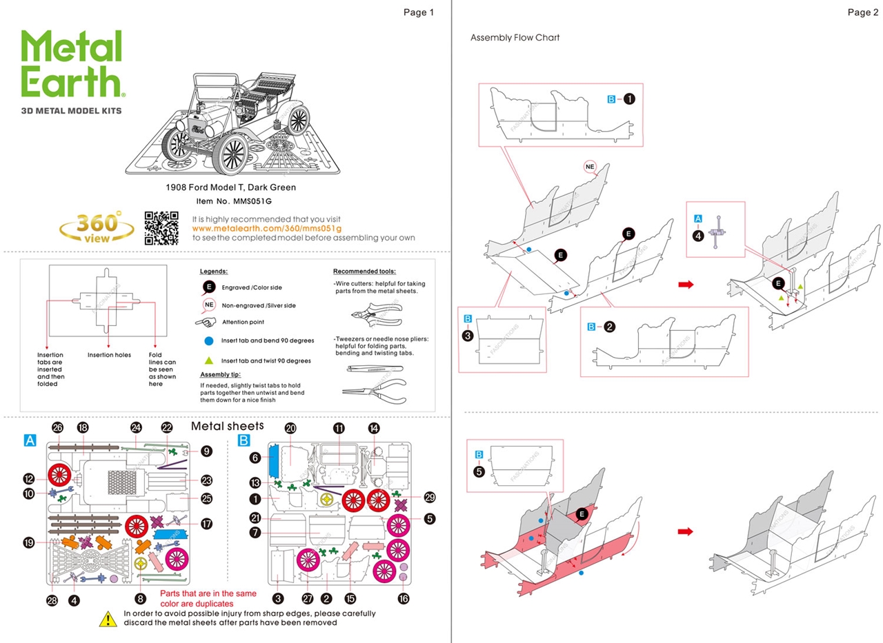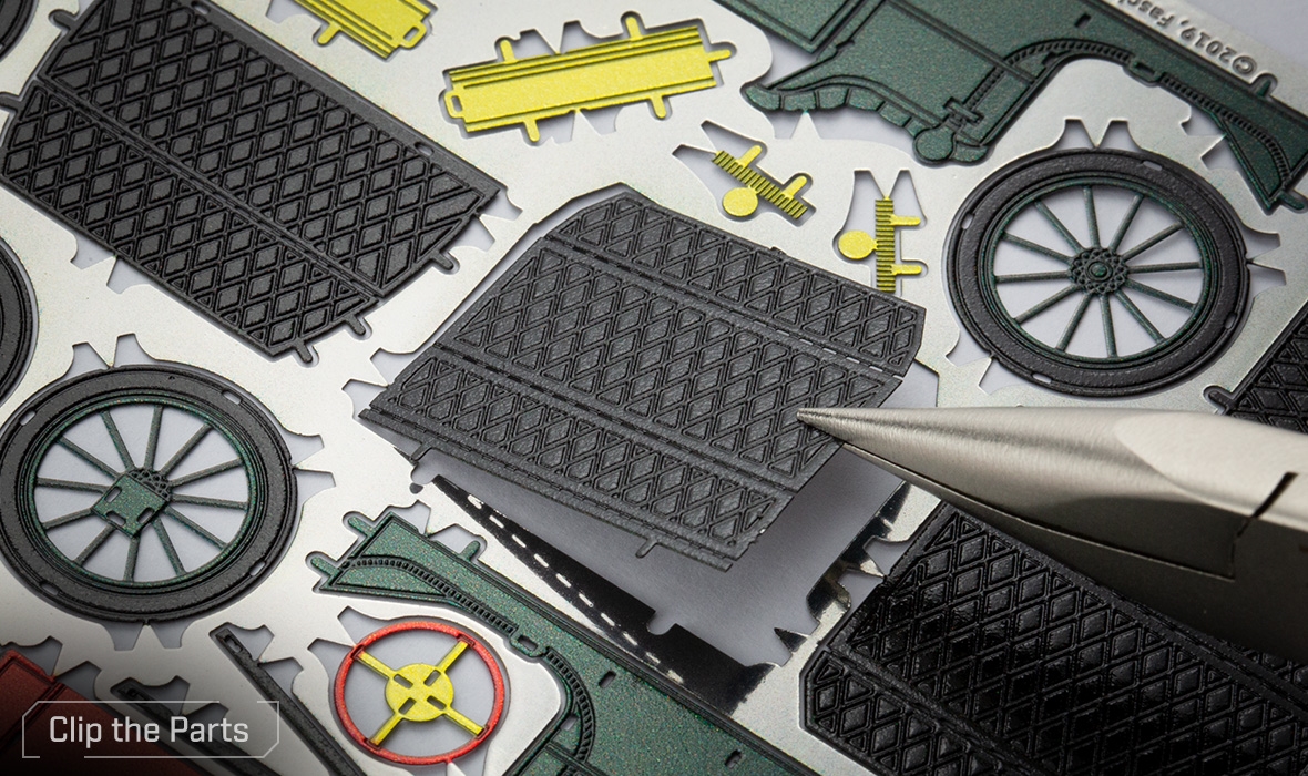 Parts can be more easily removed from the sheet using a pair of clippers. A pair of tweezers or needle nose pliers are highly recommended during assembly. Plan out and understand how the parts will come together.
