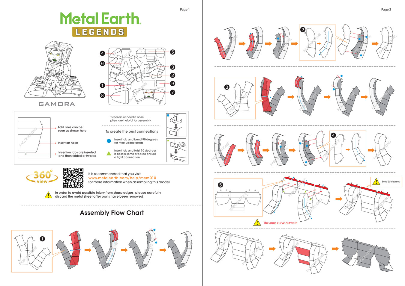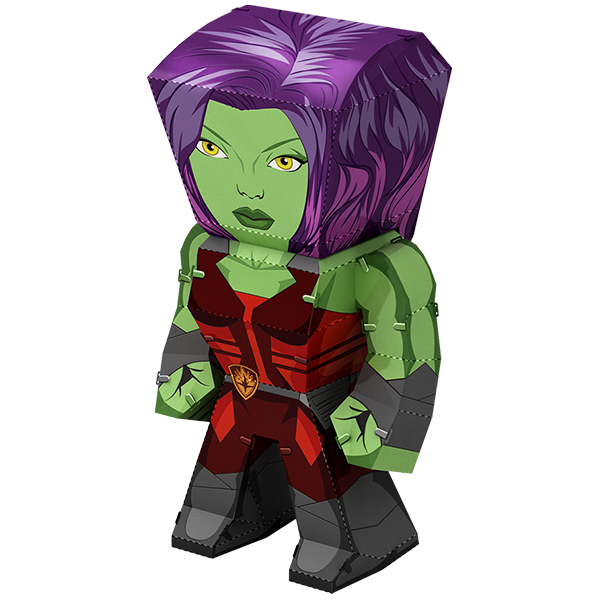 Metal Earth Legends models are full color, caricature models that are easy to assemble. They are designed to be unified in size and shape, without sacrificing the unique details of each model. Metal Earth Legends Gamora portrays a caricature version of Gamora Simply use the easy-to-follow instructions included with the sheet to pop out the pieces, bend the tabs, and connect them at the attachment points. No glue nor solder required.