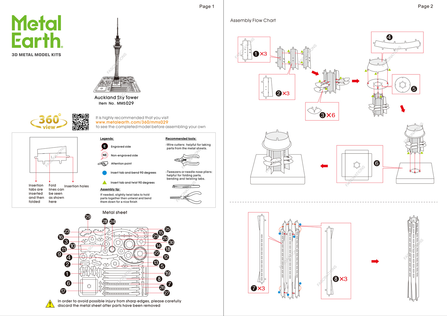 Metal Earth Auckland Sky Tower model kit is an amazingly detailed etched model that is fun and satisfying to assemble. It starts as a 4-inch square steel sheet and finishes as a 6.32" x 0.82" x 0.82" 3D model. Simply use the easy-to-follow instructions included with the sheet to pop out the pieces, bend the tabs, and connect them at the attachment points. No glue nor solder required.