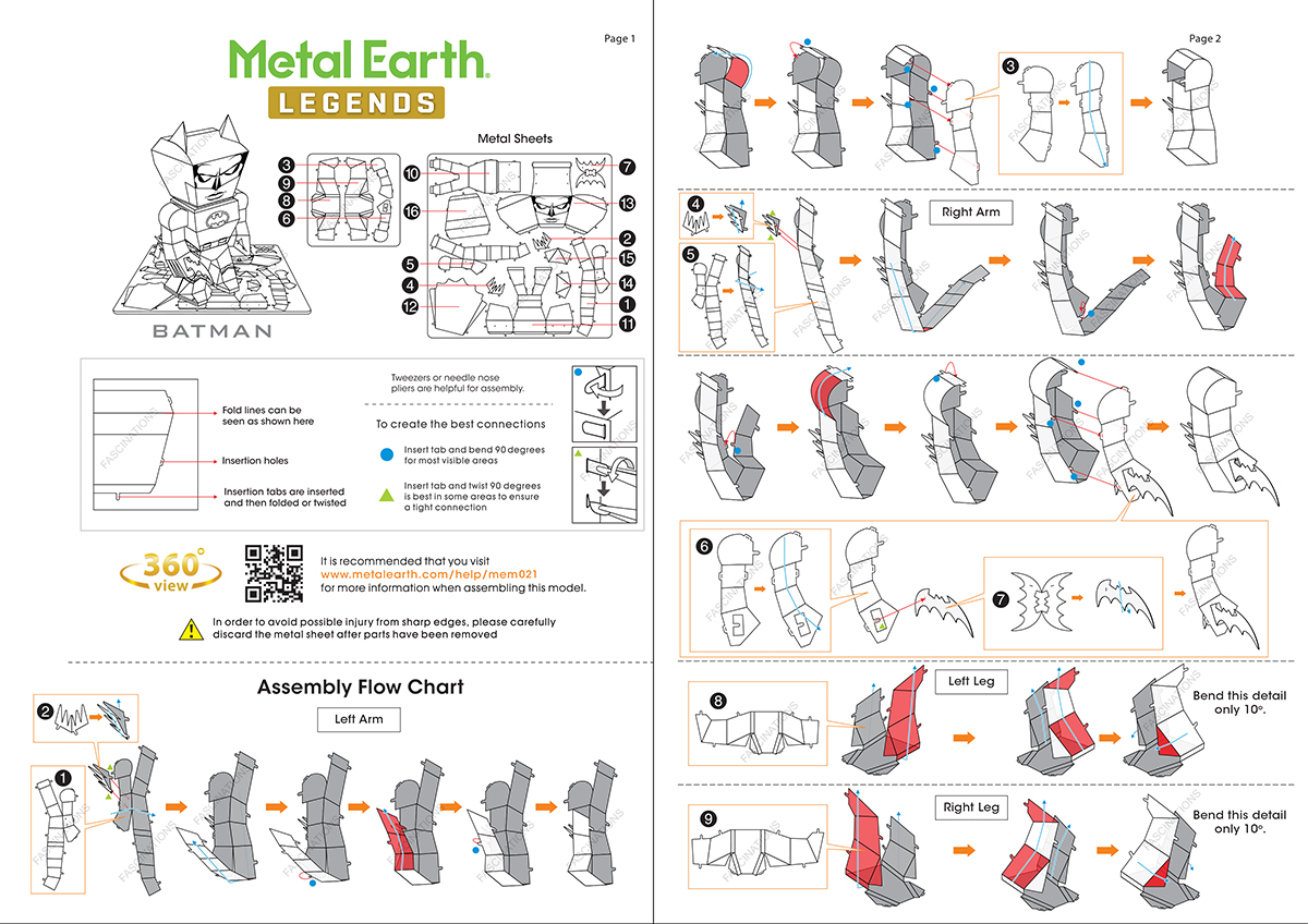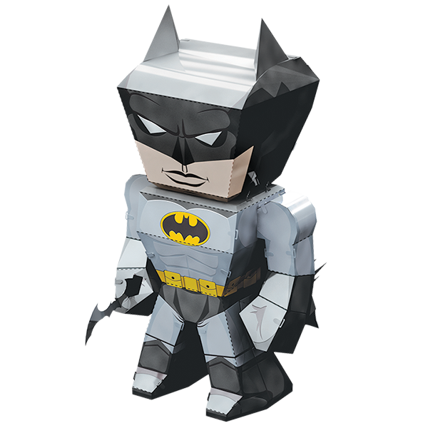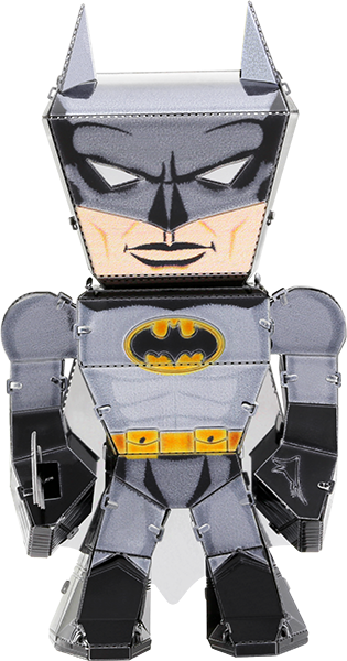 Metal Earth Legends models are full color, caricature models that are easy to assemble. They are designed to be unified in size and shape, without sacrificing the unique details of each model. Metal Earth Legends Bat Man portrays a caricature version of Bat Man. It starts as a 4-inch square steel sheet and finishes as a 1.57" x 1.5" x 2.76" 3D model. Simply use the easy-to-follow instructions included with the sheet to pop out the pieces, bend the tabs, and connect them at the attachment points. No glue nor solder required.