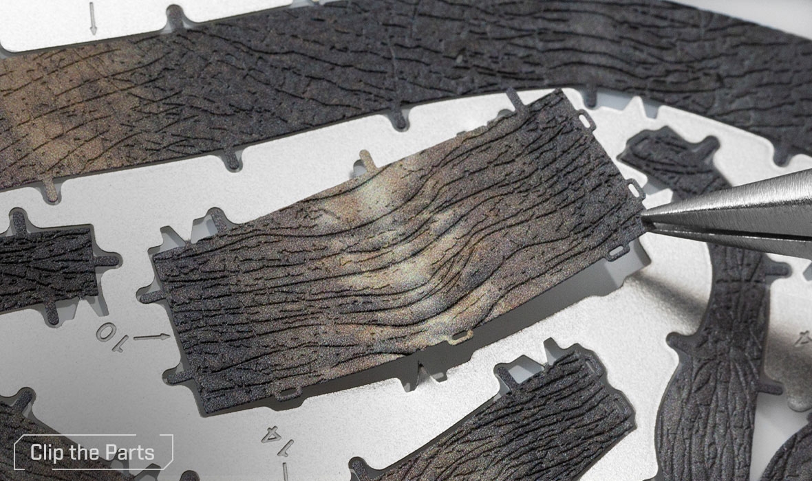 Parts can be more easily removed from the sheet using a pair of clippers. A pair of tweezers or needle nose pliers are highly recommended during assembly. Plan out and understand how the parts will come together.