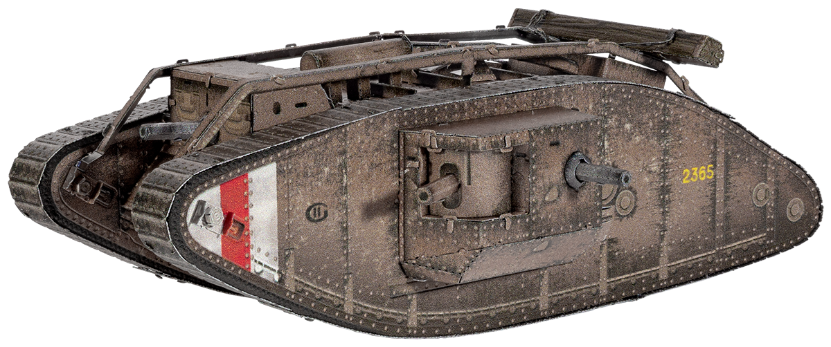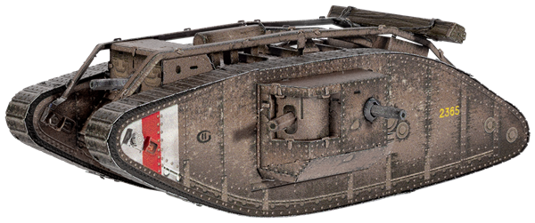 The Mark IV was a British tank produced during the First World War. Deployed in 1917, the Mark IV featured two primary barrels, as well as 3-5 machine guns. The Mark IV made history on the Western Front, where it engaged its German counterpart in the first tank-to-tank battle.