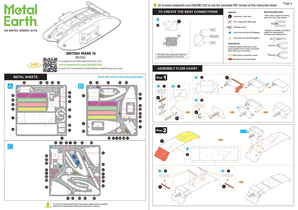Parts can be more easily removed from the sheet using a pair of clippers. A pair of tweezers or needle nose pliers are highly recommended during assembly. Plan out and understand how the parts will come together.