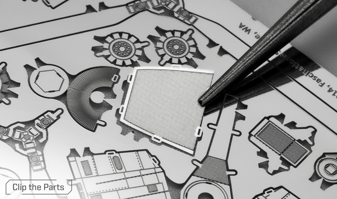 Parts can be more easily removed from the sheet using a pair of clippers. A pair of tweezers or needle nose pliers are highly recommended during assembly. Plan out and understand how the parts will come together.