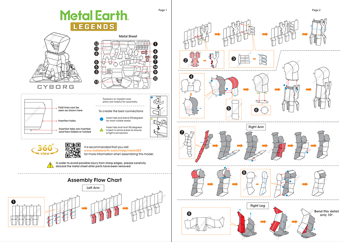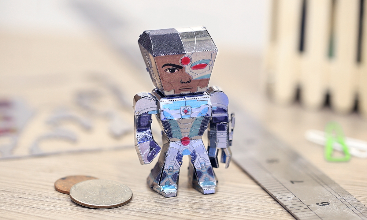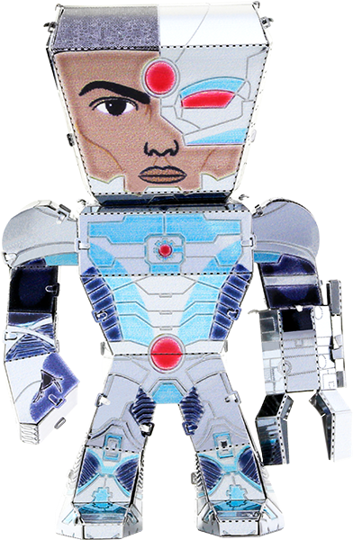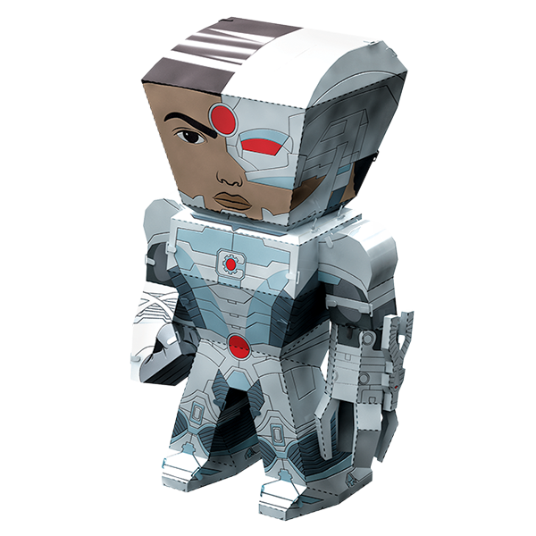 Metal Earth Legends models are full color, caricature models that are easy to assemble. They are designed to be unified in size and shape, without sacrificing the unique details of each model. Metal Earth Legends Cyborg portrays a caricature version of Cyborg . It starts as a 4-inch square steel sheet and finishes as a 1.06" x 2.44" x 2.44" 3D model. Simply use the easy-to-follow instructions included with the sheet to pop out the pieces, bend the tabs, and connect them at the attachment points. No glue nor solder required.