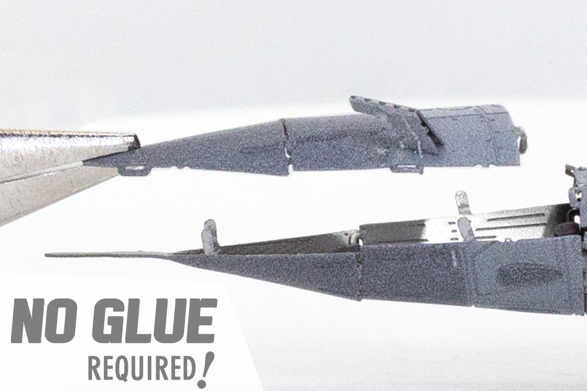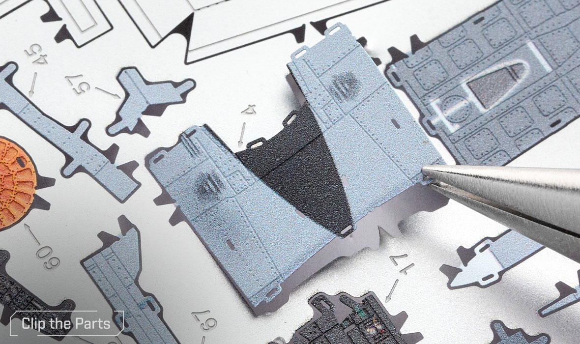 Parts can be more easily removed from the sheet using a pair of clippers. A pair of tweezers or needle nose pliers are highly recommended during assembly. Plan out and understand how the parts will come together.