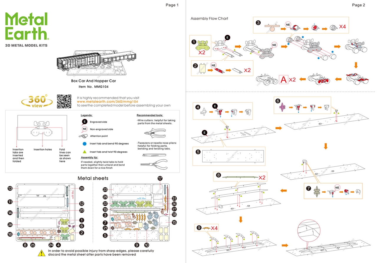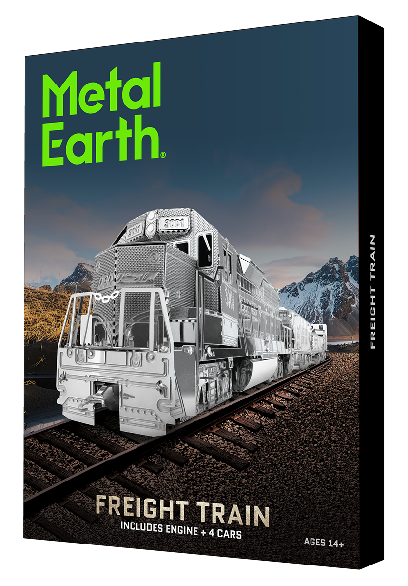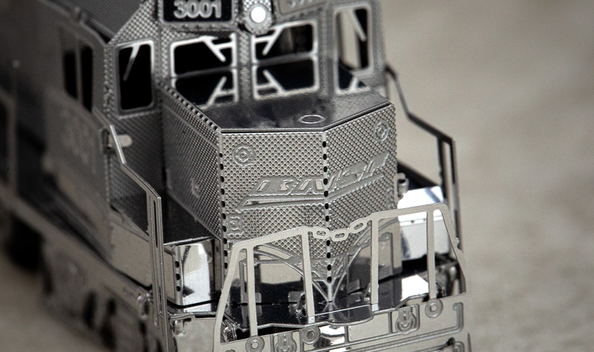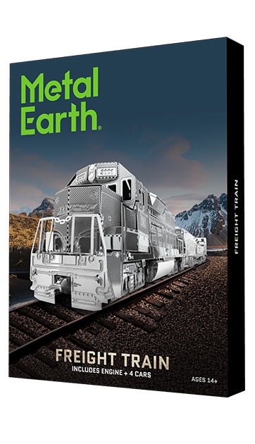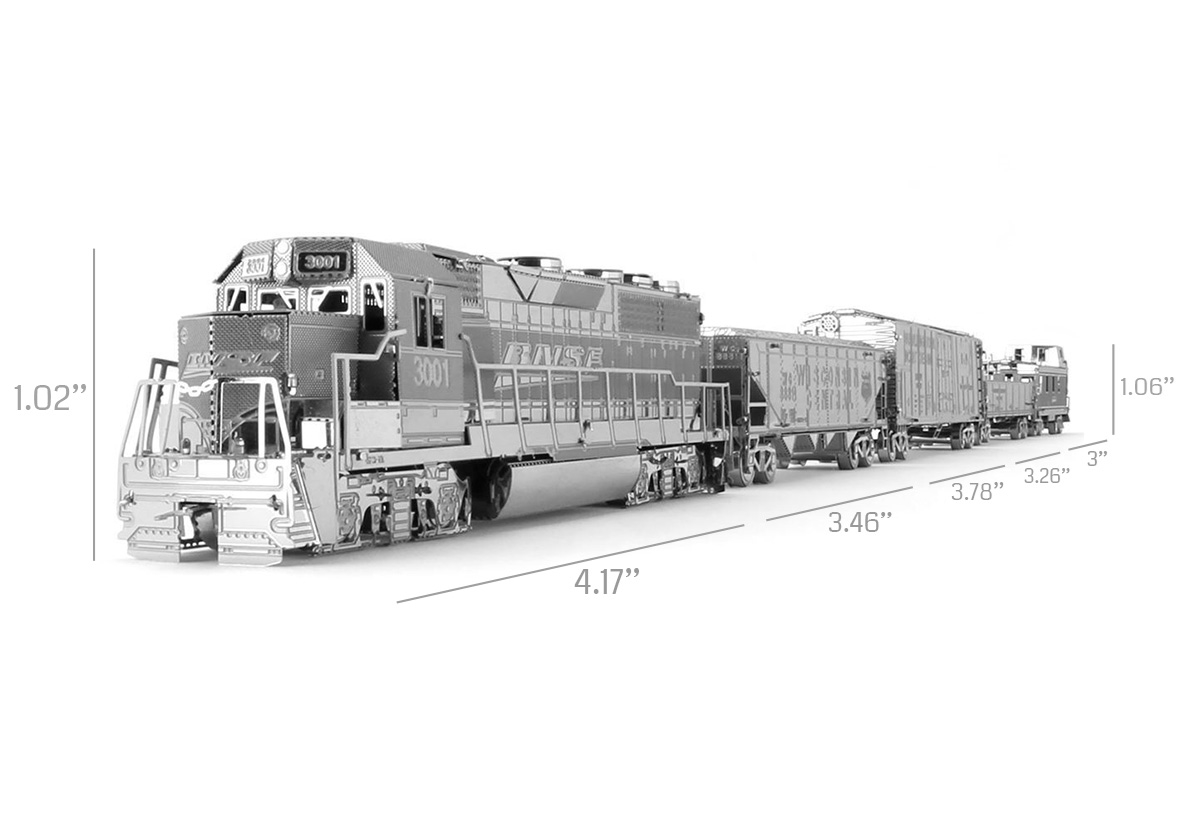 This 5 piece model train consists of five 4" x 4" steel sheets from which individual parts can be removed to assemble a museum quality model using tabs and holes. This Freight Train set includes 5 train cars including the Diesel Locomotive, Gondola Car, Box Car, Hopper Car and Off Center Caboose. The connected model length is 17 inches.