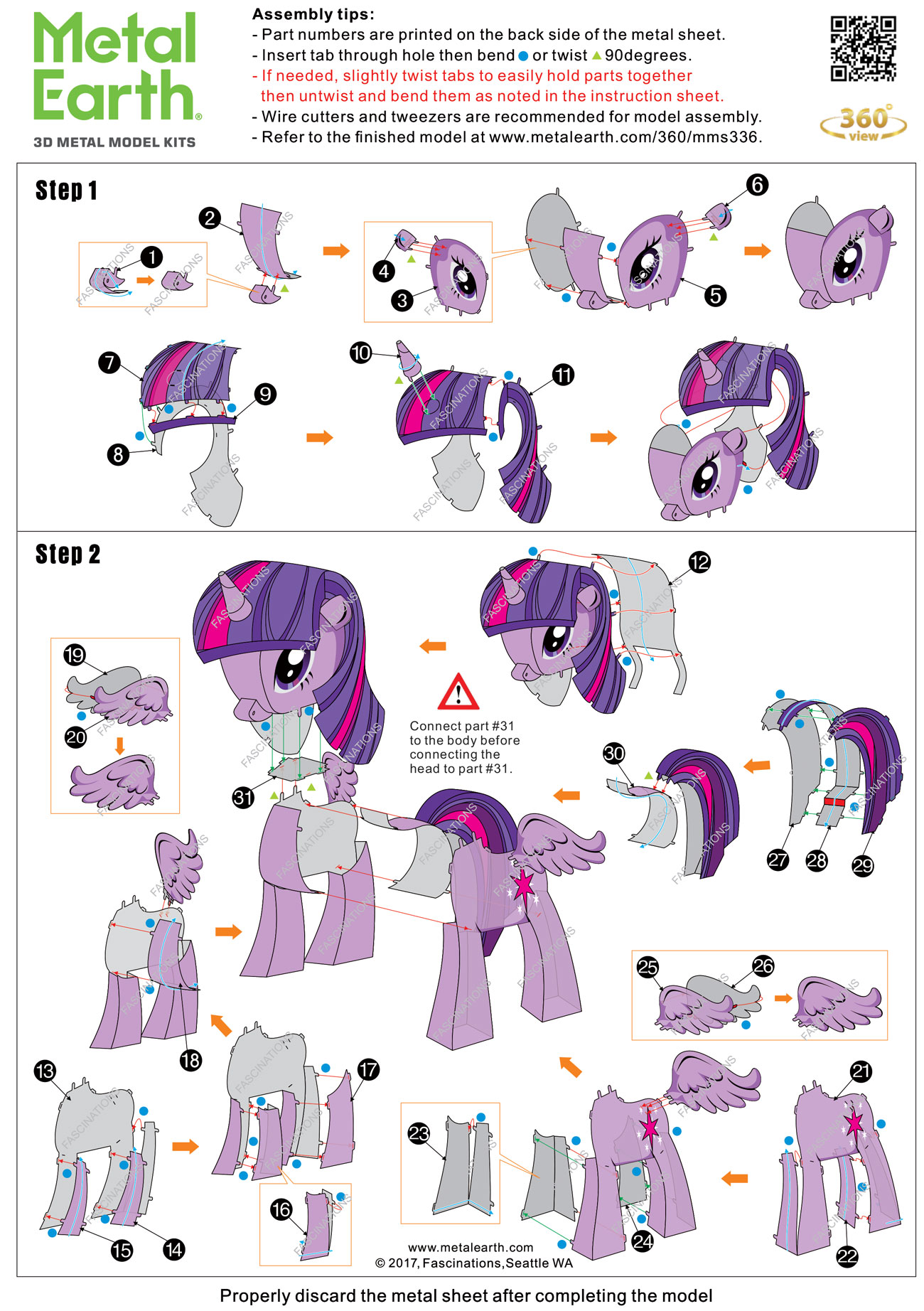 Build your own Twilight Sparkle from My Little Pony kit from Fascinations. This amazingly detailed etched model starts as a 4-inch square steel sheet and finishes as a 2.24" x 2" x 2.1" 3D model. Simply use the easy-to-follow instructions included with the sheet to pop out the pieces, bend the tabs, and connect them at the attachment points. No glue nor solder required.