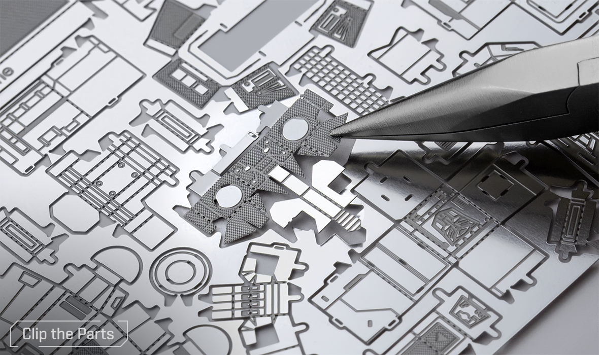 Parts can be more easily removed from the sheet using a pair of clippers. A pair of tweezers or needle nose pliers are highly recommended during assembly. Plan out and understand how the parts will come together.