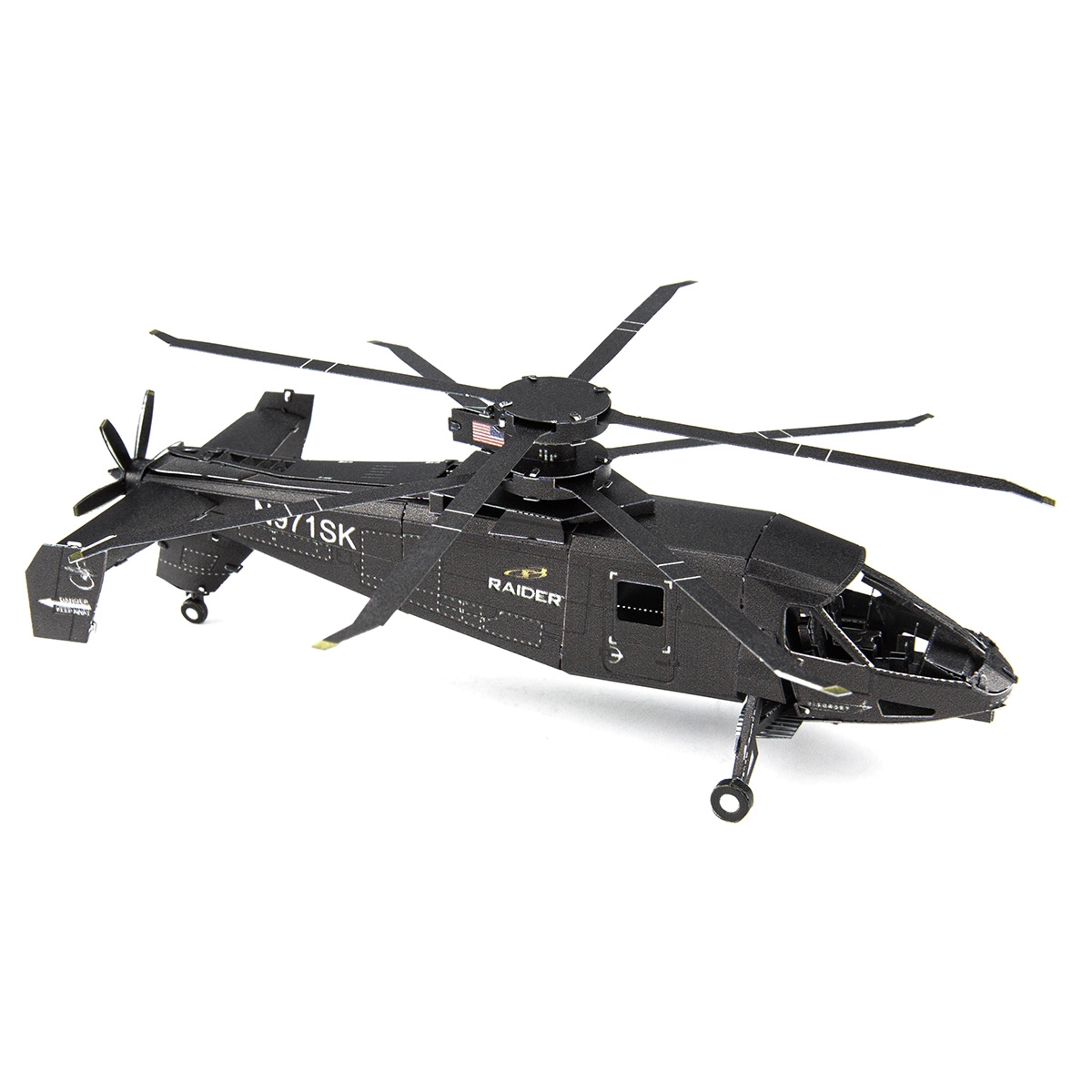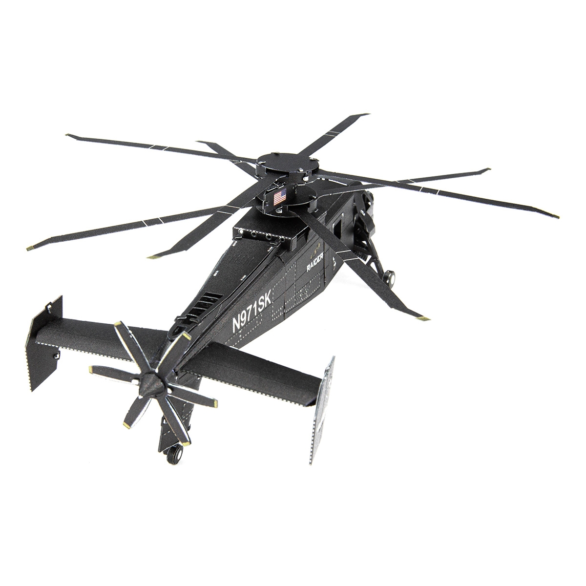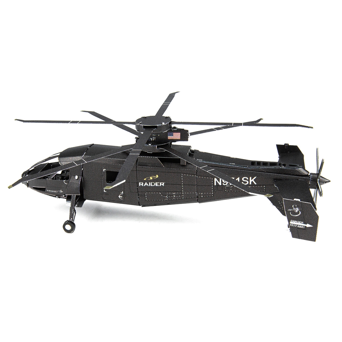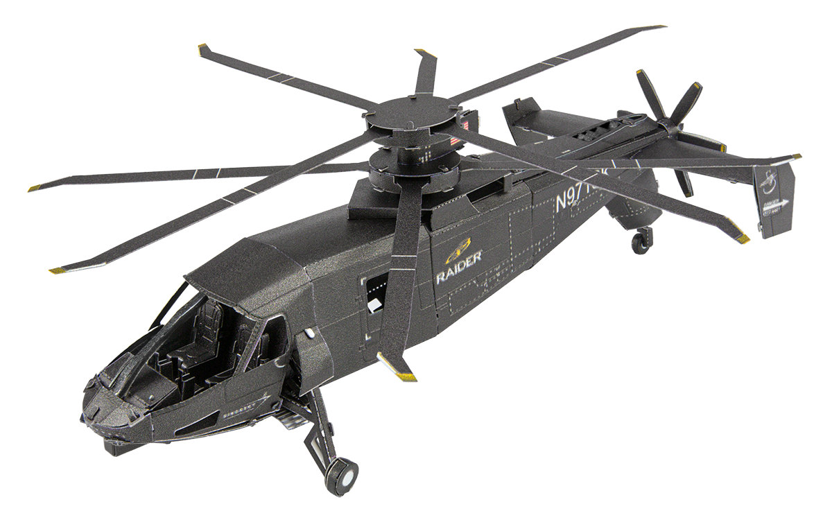 The fastest next-generation helicopter in the world, the Sikorsky® S-97 Raider® features twin four-blade contra-rotating main rotors and a rear pusher propeller, allowing for a top speed of 276 MPH. What makes the Raider even more unique is its ability to turn its rear propeller on and off for ''Whisper Mode'', allowing it to sneak up on targets.