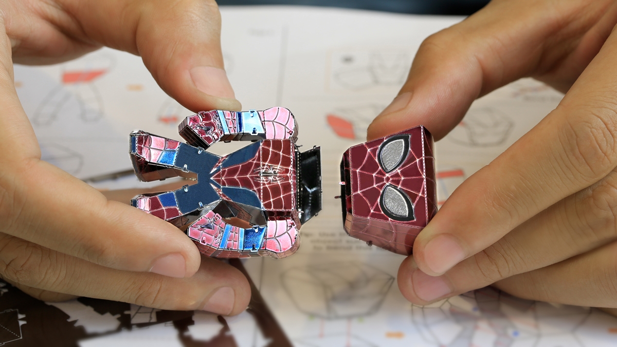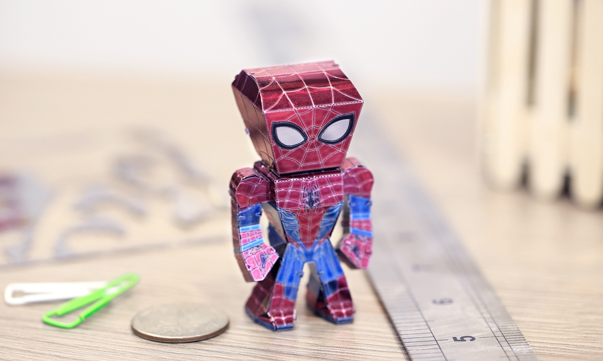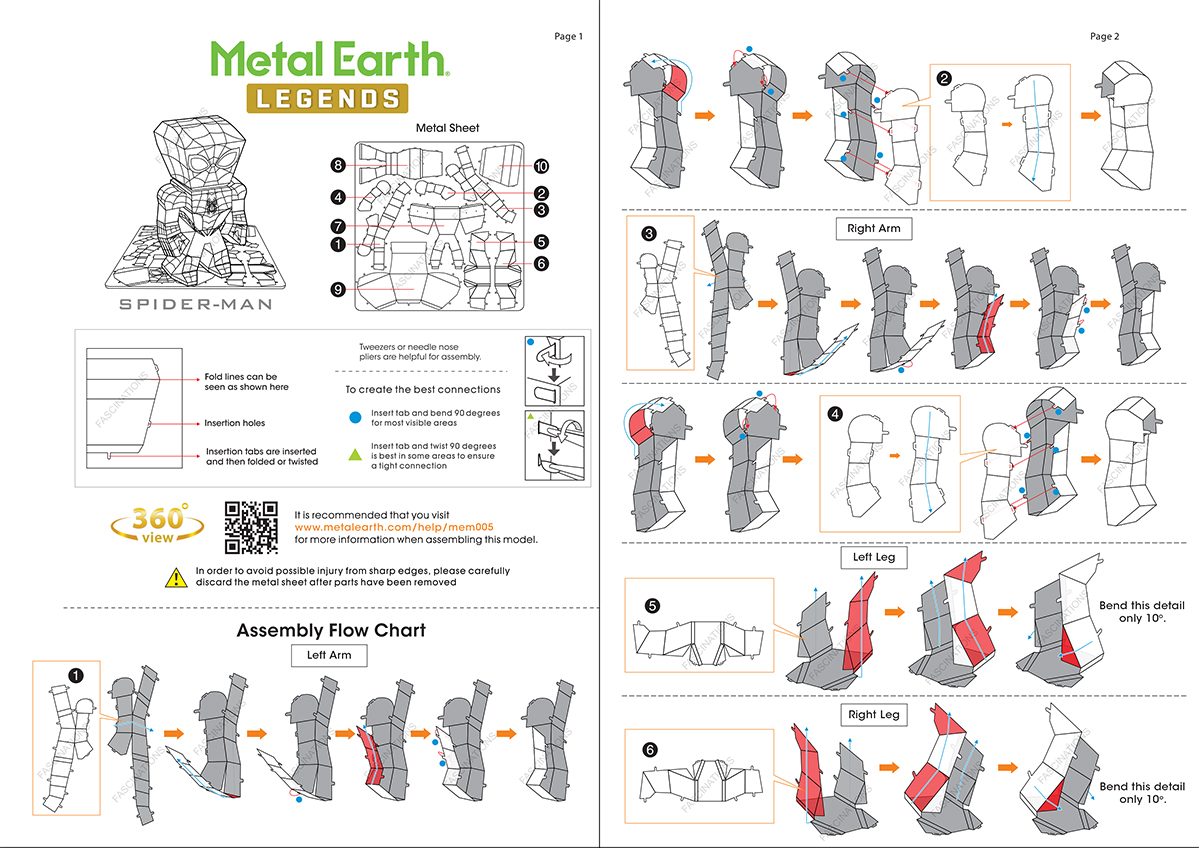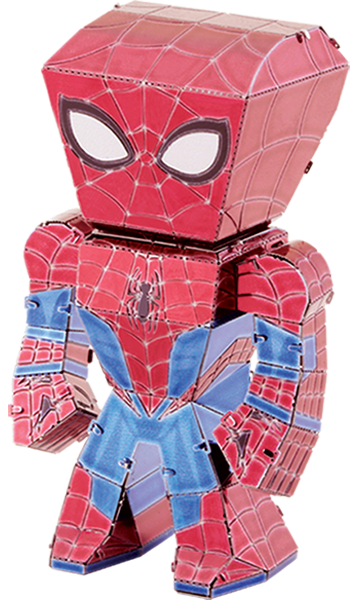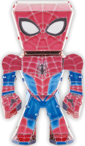 Metal Earth Legends models are full color, caricature models that are easy to assemble. They are designed to be unified in size and shape, without sacrificing the unique details of each model. Metal Earth Legends Spider-Man portrays a caricature version of Spider-Man. It starts as a 4-inch square steel sheet and finishes as a 1.5" x 1.06" x 2.44" 3D model. Simply use the easy-to-follow instructions included with the sheet to pop out the pieces, bend the tabs, and connect them at the attachment points. No glue nor solder required.