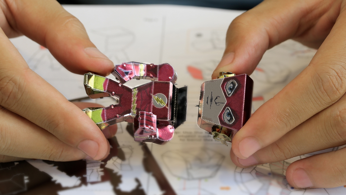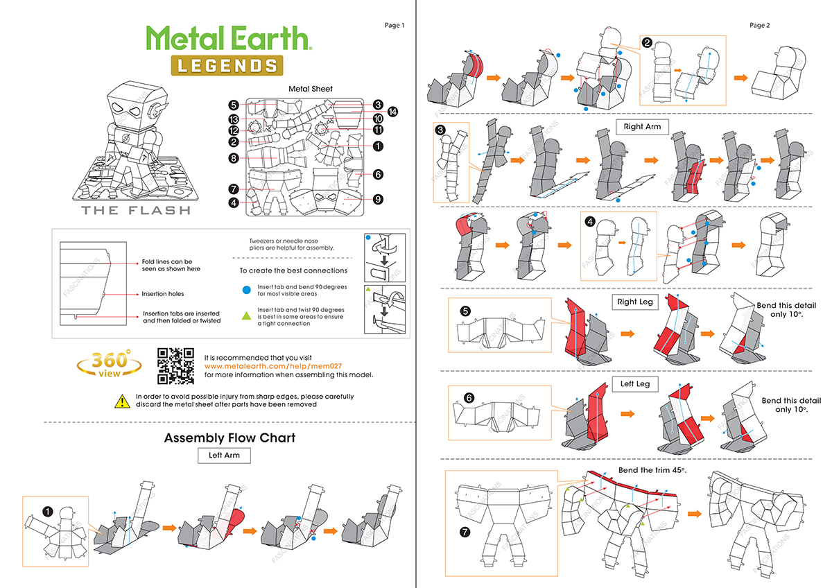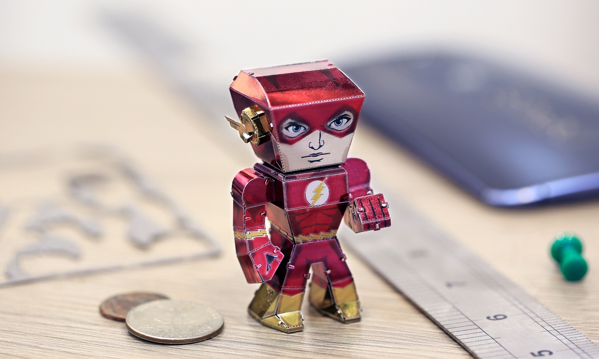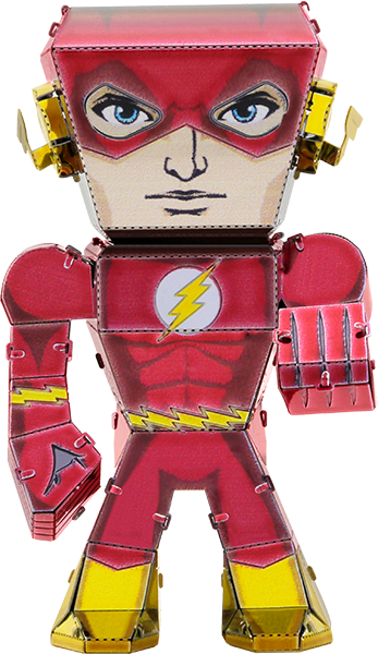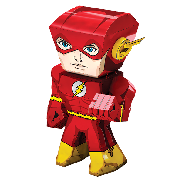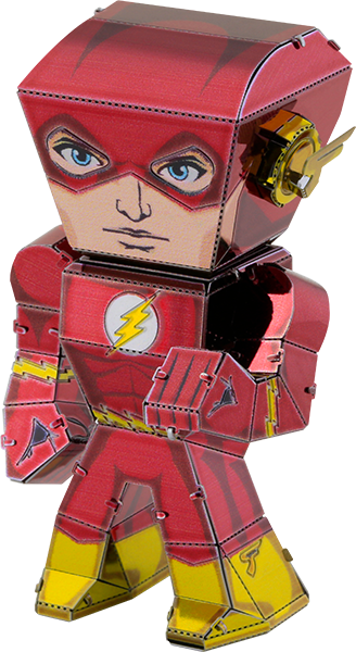 Metal Earth Legends models are full color, caricature models that are easy to assemble. They are designed to be unified in size and shape, without sacrificing the unique details of each model. Metal Earth Legends The Flash portrays a caricature version of The Flash. It starts as a 4-inch square steel sheet and finishes as a 1.57" x 1.38" x 2.44" 3D model. Simply use the easy-to-follow instructions included with the sheet to pop out the pieces, bend the tabs, and connect them at the attachment points. No glue nor solder required.