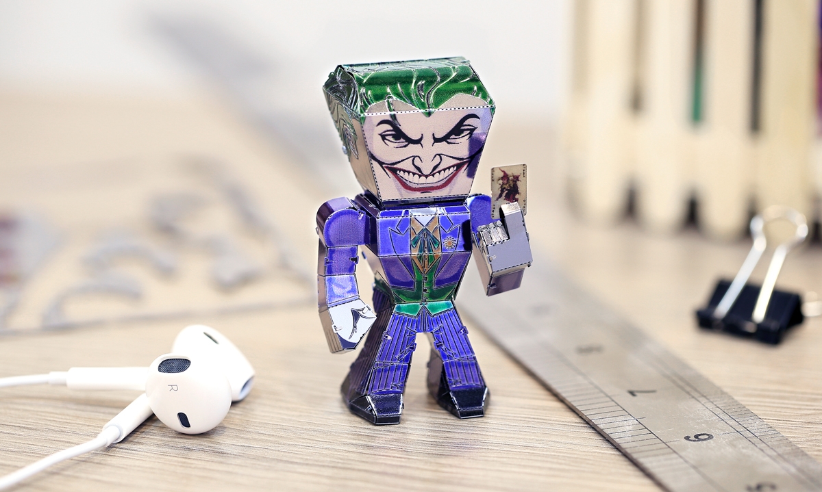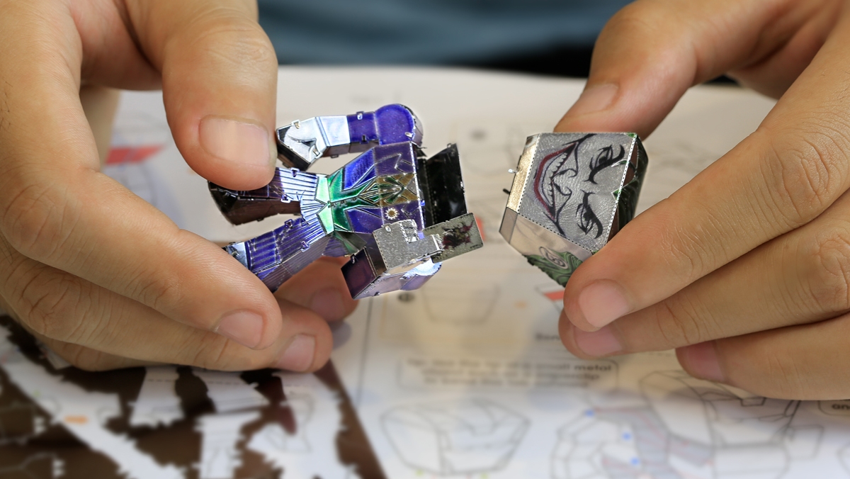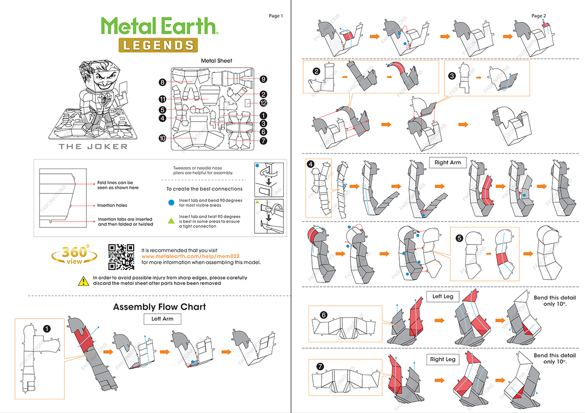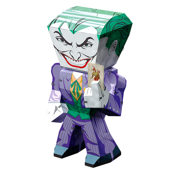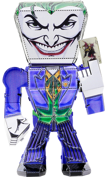 Metal Earth Legends models are full color, caricature models that are easy to assemble. They are designed to be unified in size and shape, without sacrificing the unique details of each model. Metal Earth Legends The Joker portrays a caricature version of The Joker. It starts as a 4-inch square steel sheet and finishes as a 1.5" x 2.44" x 1.34" 3D model. Simply use the easy-to-follow instructions included with the sheet to pop out the pieces, bend the tabs, and connect them at the attachment points. No glue nor solder required.