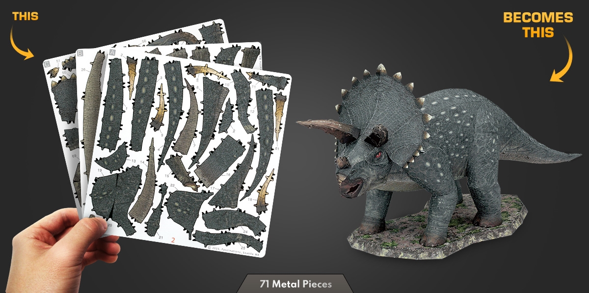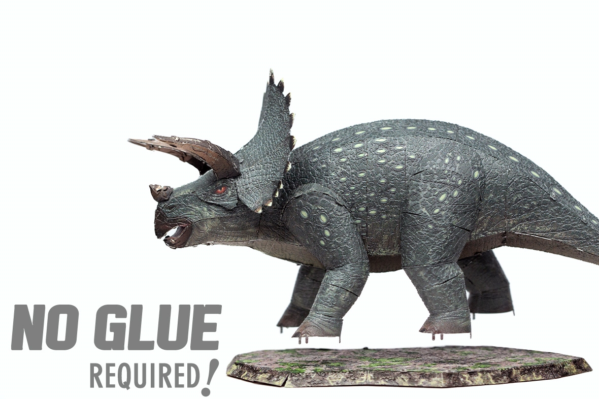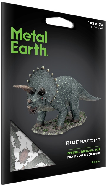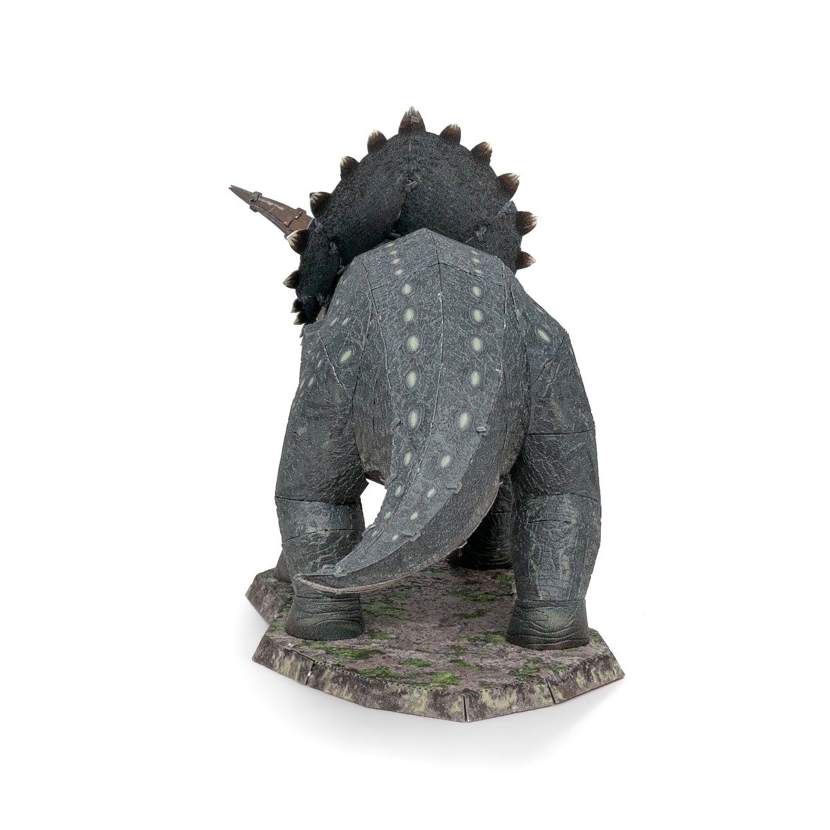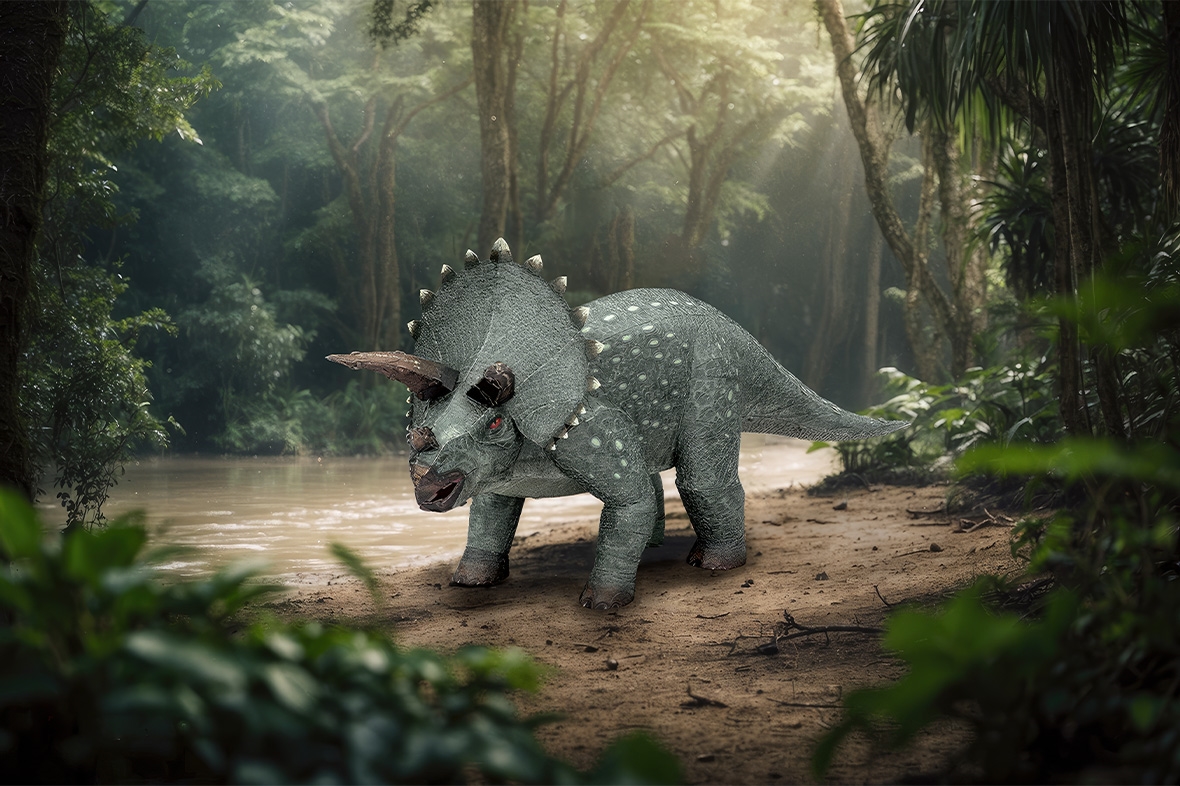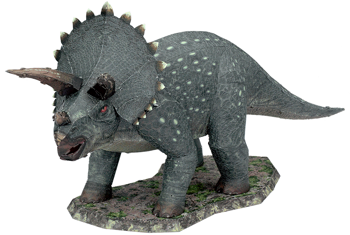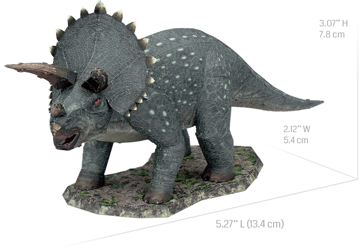 The name from Greek means 3 horned face. This dinosaur was about 30 feet long, 10 feet tall and weighed 4 to 6 tons. Stout limbs supported its girth but it was unlikely the dinosaur could move very quickly. Like a modern-day rhinoceros, it probably spent much of its time grazing on plant matter.